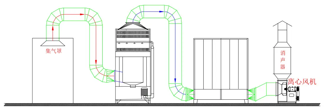 當生產作業時,煙塵廢氣在風機牽引力的作用下進入高速混流導軌裝置,煙塵廢氣在離心力的作用下進行氣液乳化反應,在混流液的高速旋轉狀態下,污染物與旋轉液體充分混合吸收相溶增加煙塵比重,利用旋流裝置設計好的離心力達到氣液分離,分離后的氣體進入環保填料吸附層,螺旋噴頭噴出的對應溶劑均勻分布在填料上,由于填料的合理設計,污染物浸透在填料的時間較長,與反應液在專用環保填料表面有充分的氣液相溶反應時間從而達到達標排放的目的。